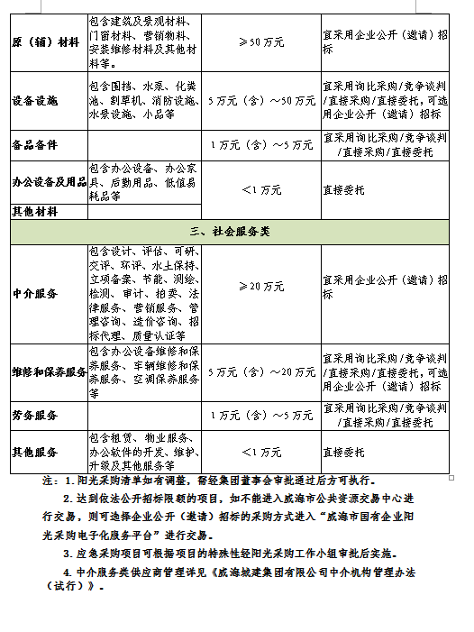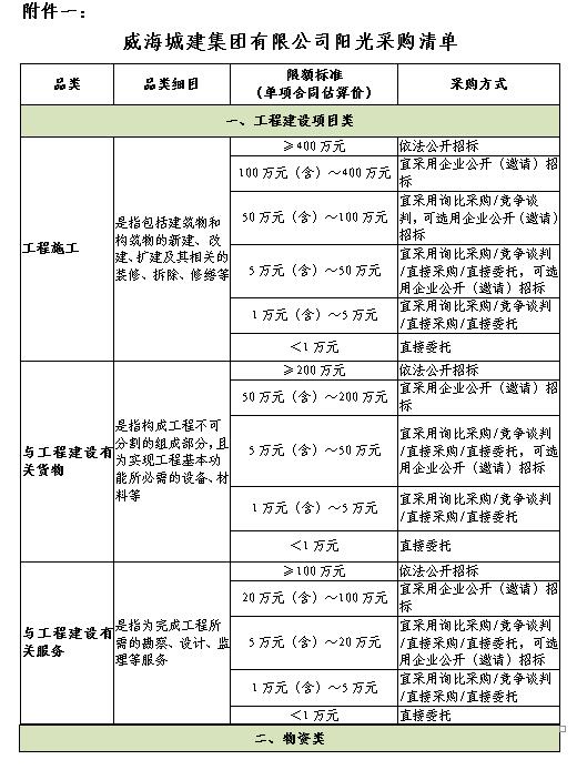 第十七條 本制度規(guī)定的采購范圍包括工程建設(shè)項目、物資和社會服務(wù)的招標采購(詳見附件一《威海城建集團有限公司陽光采購清單》)。