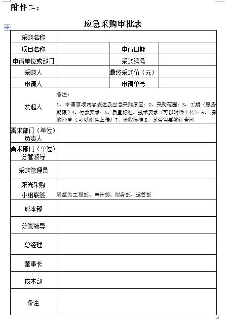 第二十二條 應(yīng)急采購經(jīng)需求部門(單位)負責人、分管領(lǐng)導(dǎo)、總經(jīng)理同意后由需求部門(單位)直接采購;事后由需求部門(單位)提交《應(yīng)急采購審批表》(詳見附件二),說明應(yīng)急采購的具體原因經(jīng)評審?fù)ㄟ^后,財務(wù)可直接付款。如果評審后認定該事項不屬于應(yīng)急采購的,參照本制度第七章工作紀律進行問責。