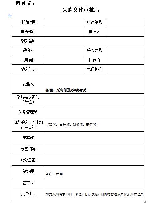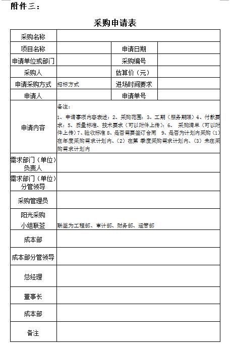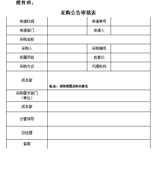 3.工作流程:需求部門(單位)提報《采購申請表》,按規(guī)定程序?qū)徟ㄟ^后,由成本部委托招標代理機構(gòu)具體實施。